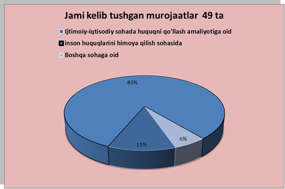 Xususan, Inson huquqlarini himoya qilish sohasidagi murojaatlarning 0,75 foizi (30 ta) vajlar o'z tasdig'ini topganligi sababli qanoatlantirildi.