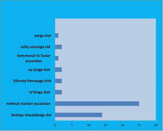 Murojaatlar sohalar bo'yicha tahlil qilinganda ularning aksariyati ish haqi va unga tenglashtirilgan to'lovlarning to'lanishi, yoshga doir pensiya, mehnat qonunchiligi bilan bog'liq muammolar yuzasidan, kommunal soha, yo'l qurilishi, kadastr hujjatlarini tayyorlash, kam ta’minlangan oilalar uchun moddiy yordam olish masalalari tashkil etiladi.